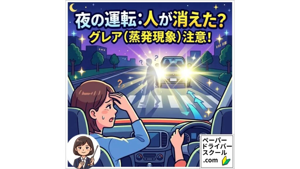 夜間運転で対向車のライトが眩しい?それ「グレア現象」かも。ペーパードライバーさんも安心!見えにくい原因と対策を優しく解説します。